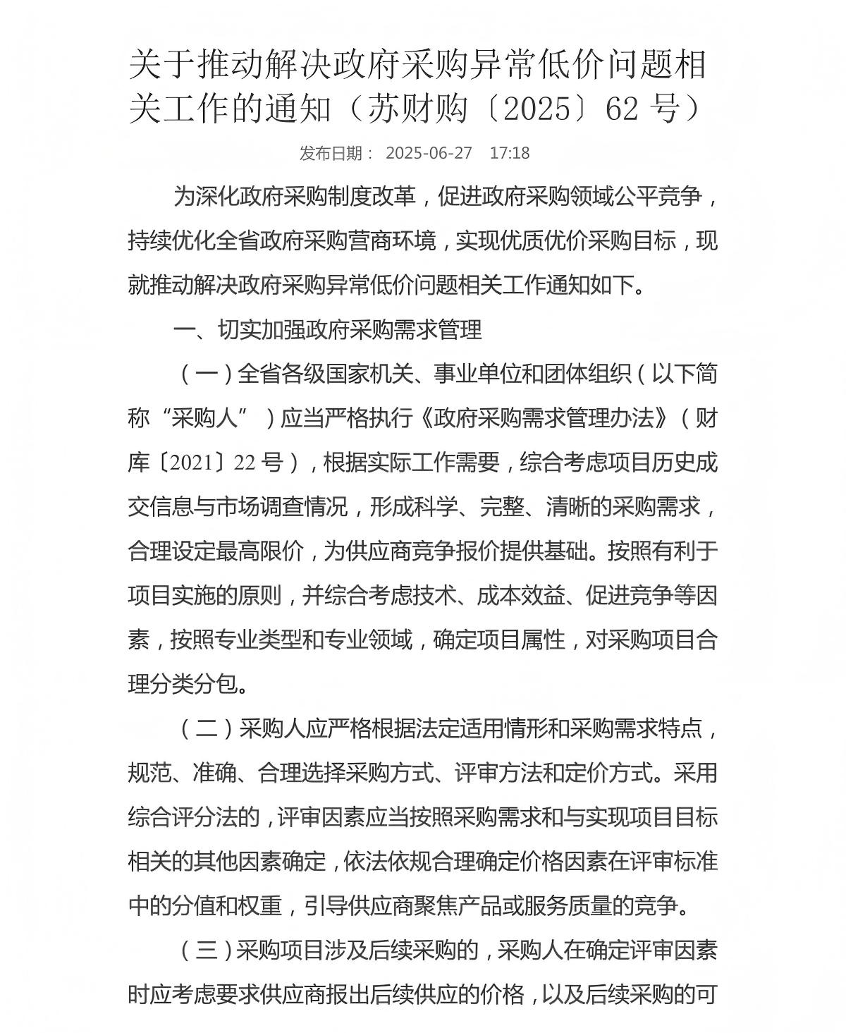 关于推动解决政府采购异常低价问题相关工作的通知(苏财购〔2025〕62号)